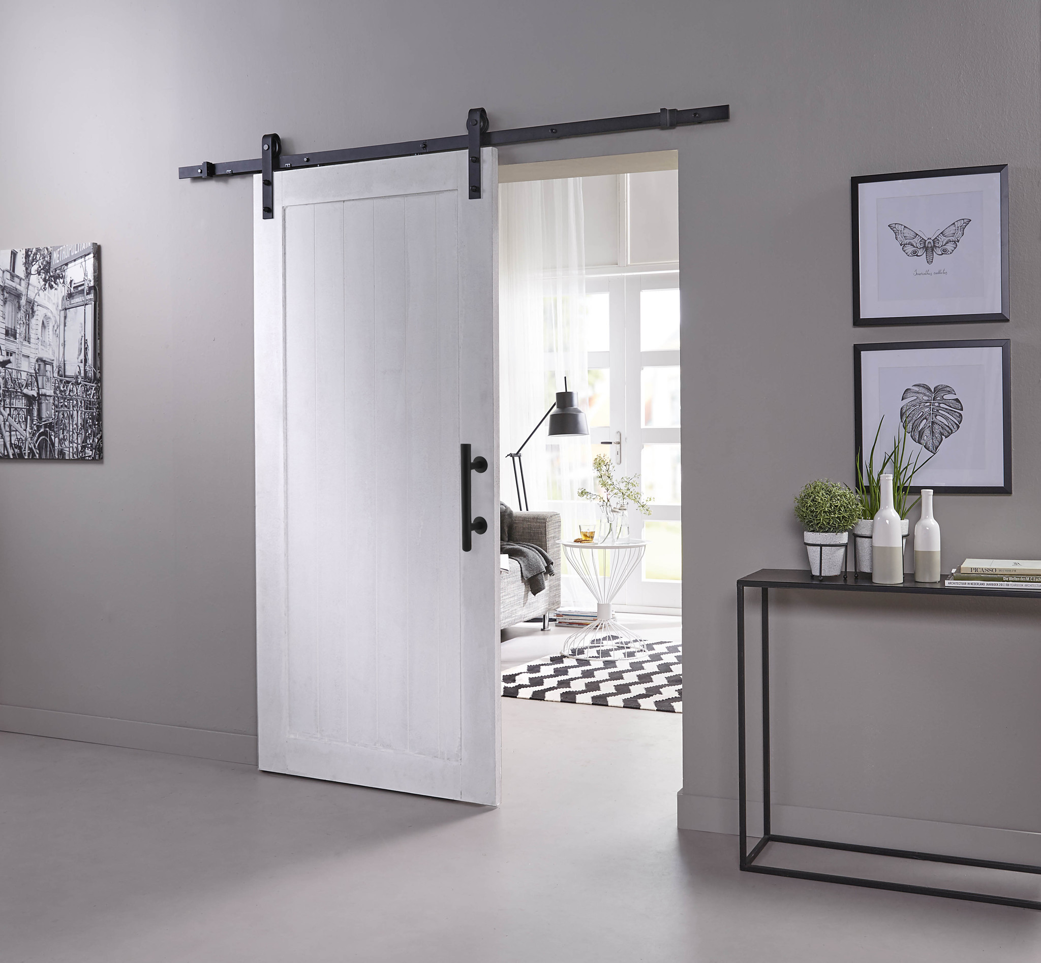 DIY schuifdeur Legno 2115x930X38mm massief MDF wit gegrond + zwart ophangsysteem Basic incl. greep/schuifdeurkom