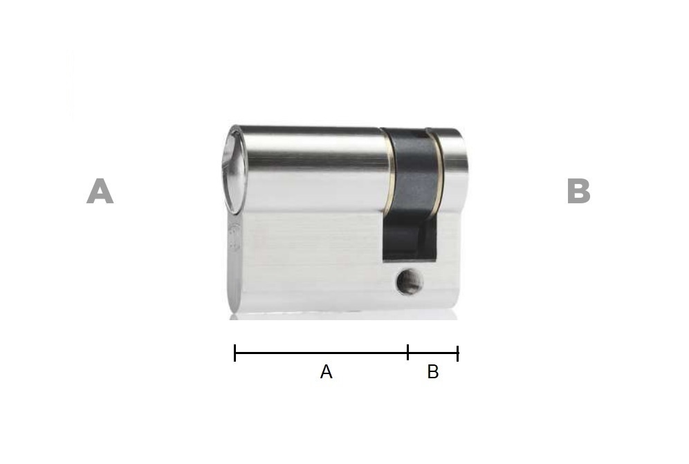 De cilinders zijn leverbaar in verschillende lengtes. Standaard begint de cilinder bij 30/10mm en verder kan hij aan de buitenzijde (A) iedere keer met 5mm verlengd worden.