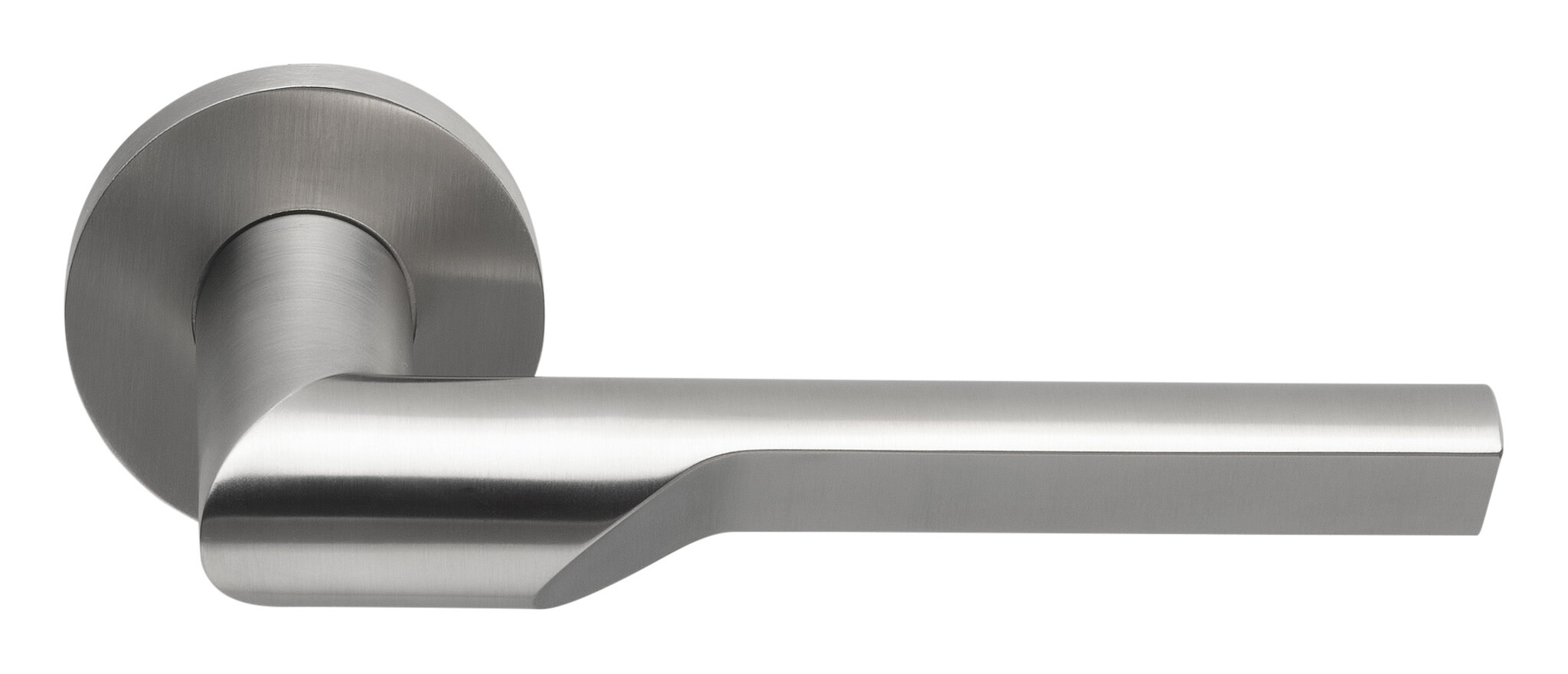 Beschrijving Massieve geveerde deurklinken RIVIO op een rond rozet van Formani met een strakke rechte hoek