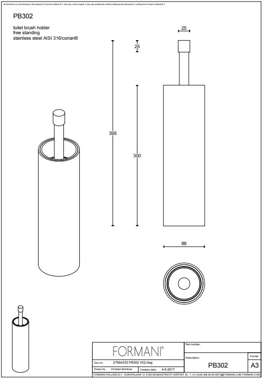 Beschrijving Staande toilet borstel ontworpen door Piet Boon ONE PB302 voor Formani afgewerkt in geborsteld RVS gecombineerd met wit Corian