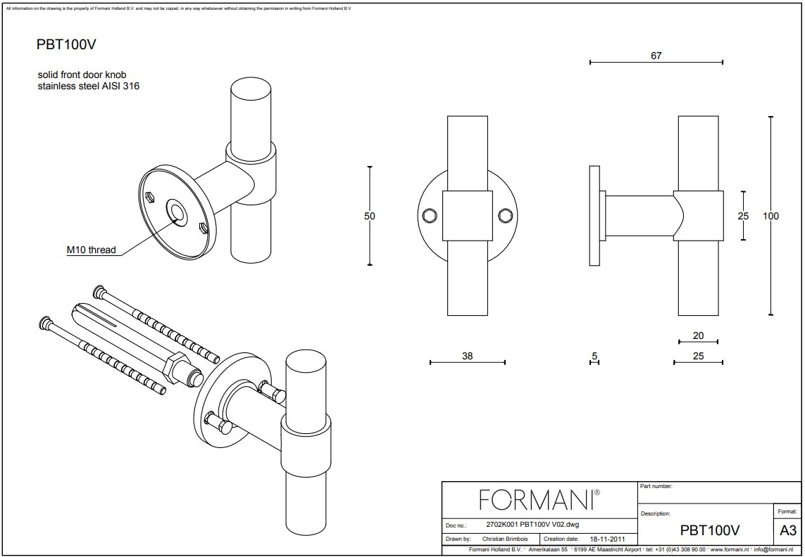 Beschrijving Massieve vaste voordeurknop van ontwerper Piet Boon voor Formani ONE PBT100V afgewerkt mat zwart PVD
