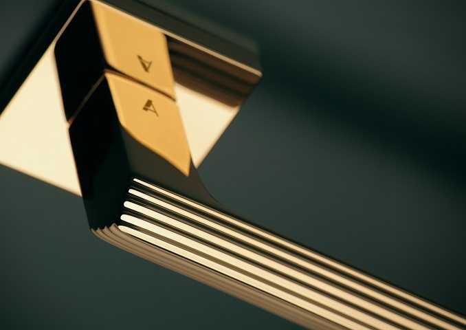 Deze exclusieve Design deurklinken hebben een zeer speciale uitstraling door de langwerpige rondom geslepen groeven en zijn afgewerkt in gepolijst goud..