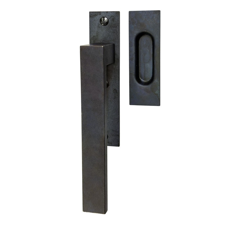 Beschrijving HALCÖ hefschuifdeurgreep met schuifdeurkom uitgevoerd in ambachtelijk zwart staal met schuifdeurkom. Blinde of zichtbare bevestiging