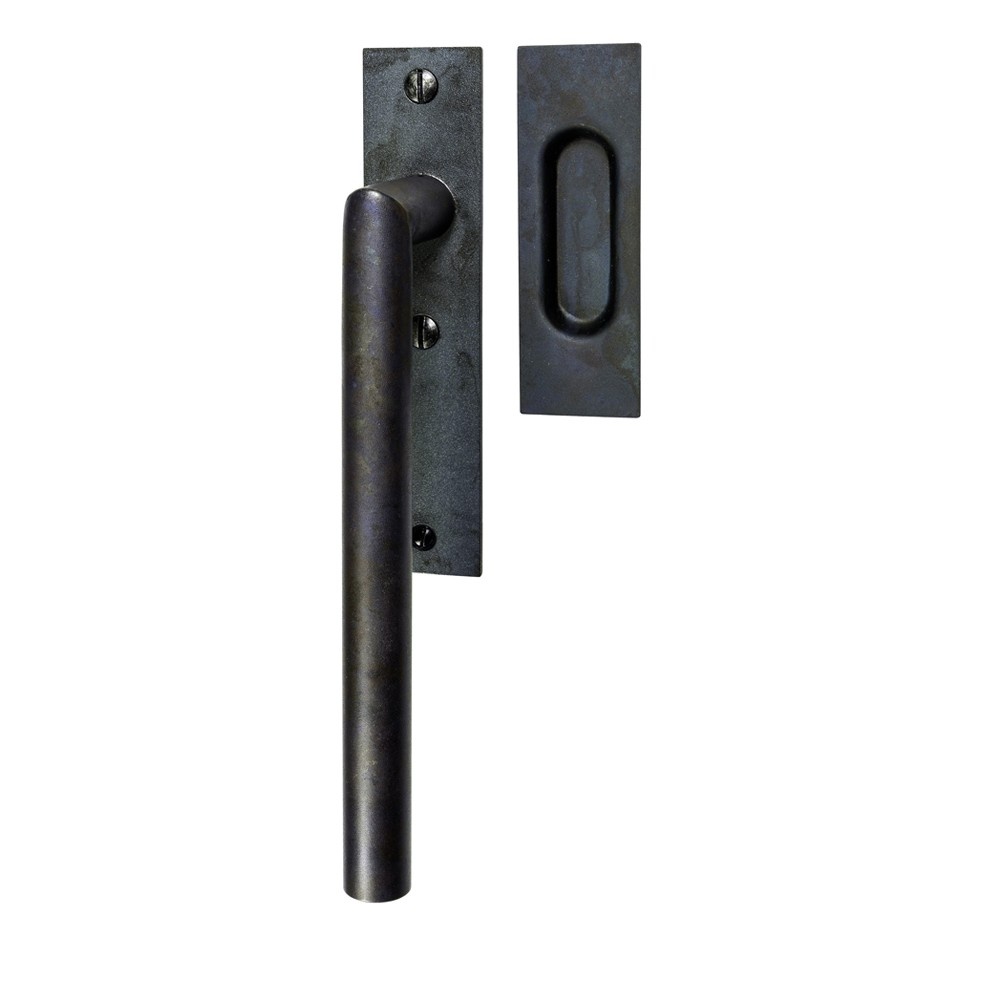 Beschrijving HALCÖ hefschuifdeurgreep met schuifdeurkom uitgevoerd in ambachtelijk zwart staal met schuifdeurkom. Blinde of zichtbare bevestiging. Rechthoekig of ovaal