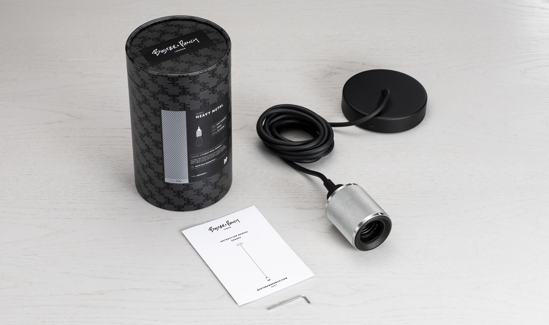 Deze RVS lamp heeft een E27 fitting en wordt geleverd met mat zwart rubberen snoer van 3m en een mat zwart plafondkapje. Het licht ziet er het beste uit in combinatie met een van onze LED BUSTER LAMPEN.
