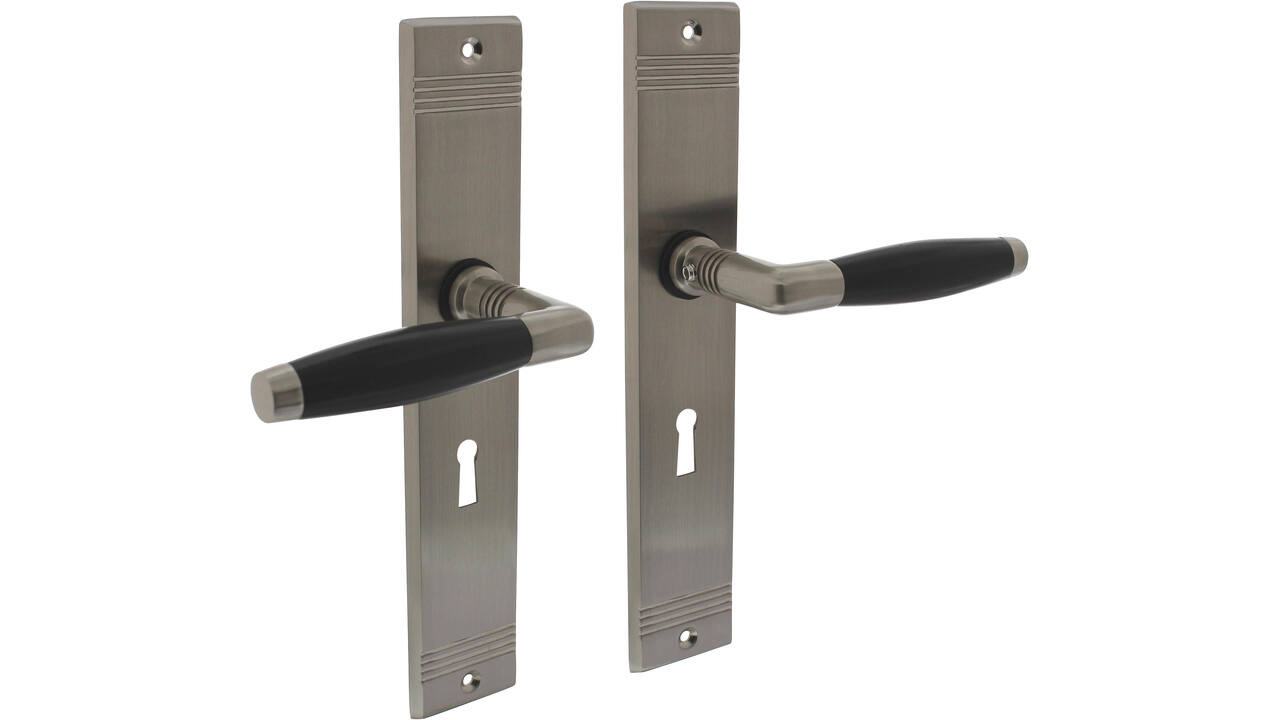 Deurkruk 'Ton Basic' met schild is uitgevoerd in nikkel en naderhand geborsteld, waardoor hij een mat uiterlijk krijgt. Door de combinatie met een ebbenhouten greep, heeft deze deurklink een bijzondere uitstraling.