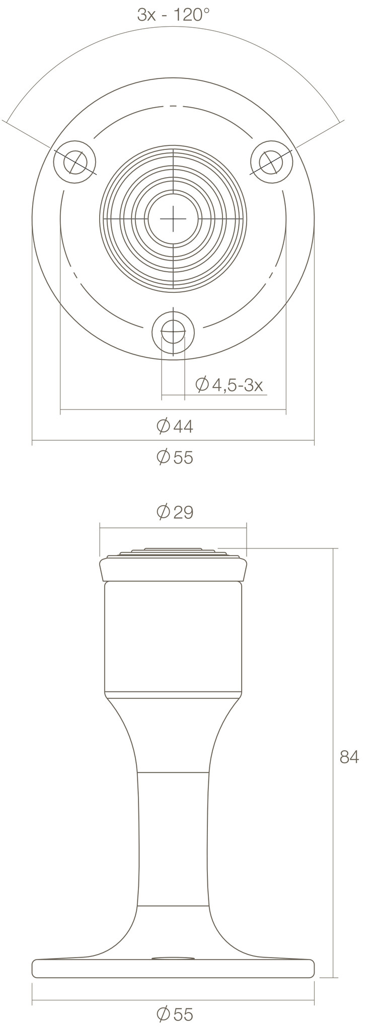 Deze messing deurstop heeft een lengte van 84mm, het rubber gedeelte heeft een Ø van 29mm en de voet heeft een Ø van 55mm.