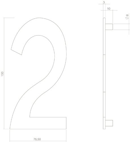 Dit zwarte huisnummer "2" van Intersteel heeft een hoogte van 150mm en een dikte van 3mm. Bij montage komt het 10mm van de muur naar voor.