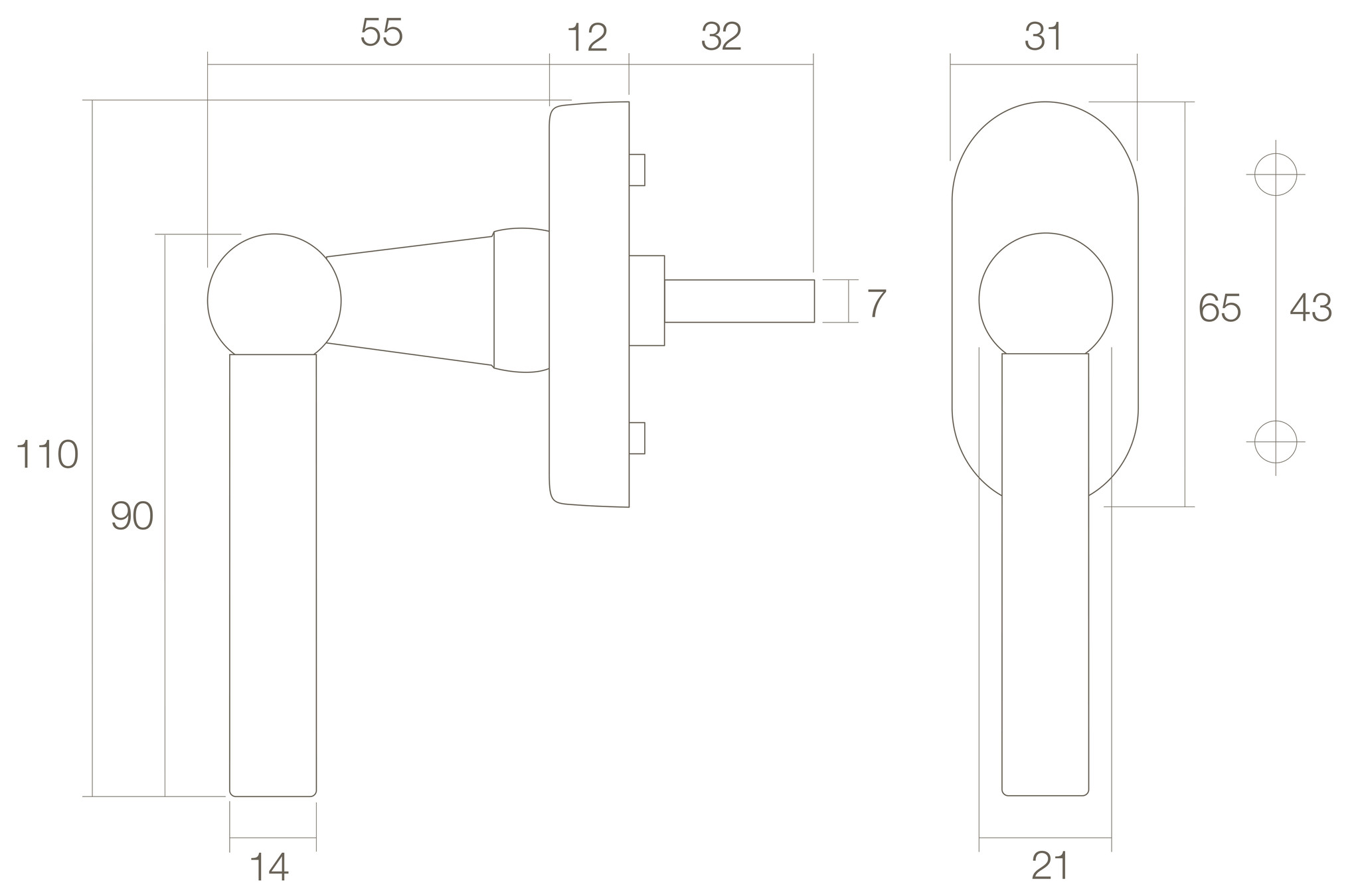 Bij deze messing raamkruk staat L-vormige handgreep met een dikte van 14mm en staat op een ovaal rozet van 65 x 31mm dat 12mm naar voor komt. De bevestigingsgaten staan 43mm uit elkaar.