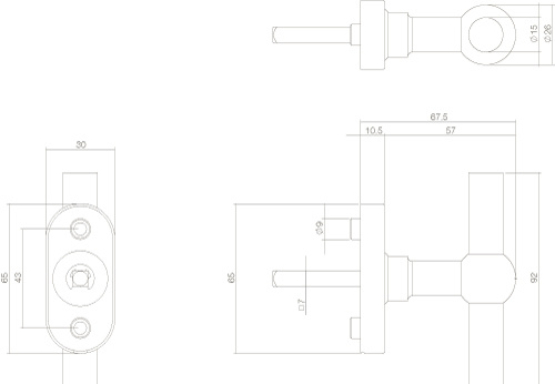 De T-vormige greep staat op een ovaal rozet van 65x30 mm dat 10.5 mm naar voor komt. De bevestigingsgaten staan 43 mm uit elkaar.