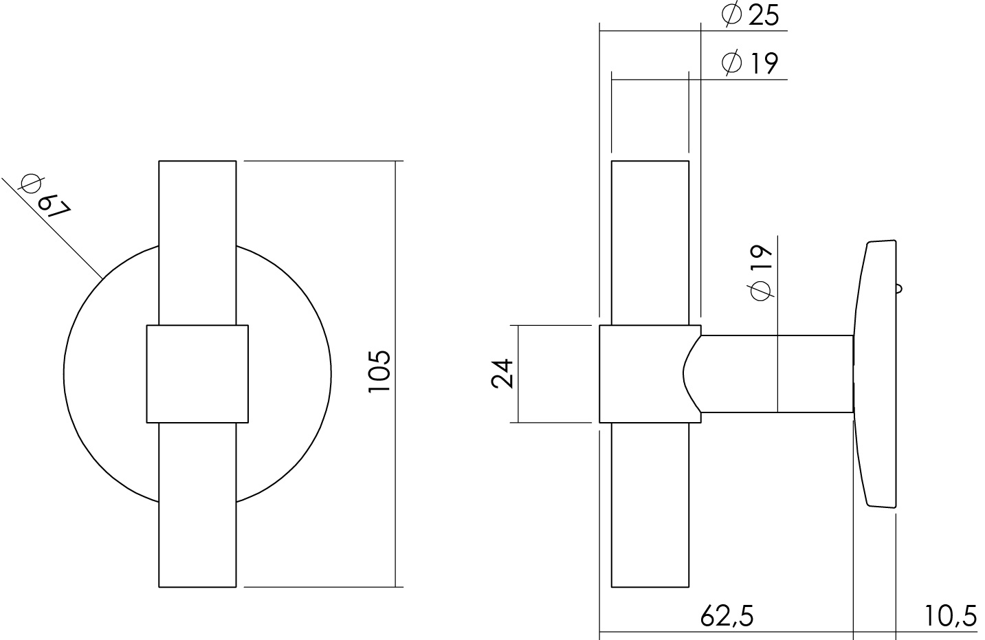De knop T-model heeft een hoogte van 105 mm en een diameter van 19 mm en de achterplaat is 66 mm.
