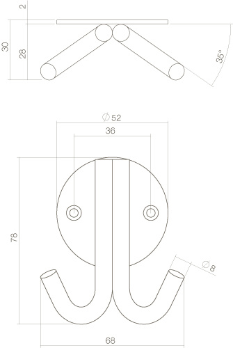 Deze dubbele haak op een rond rozet heeft een lengte van 30 mm en een hoogte van 78 mm en is uitgevoerd in roestvast staal.