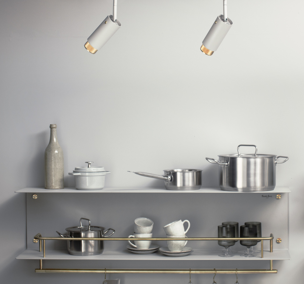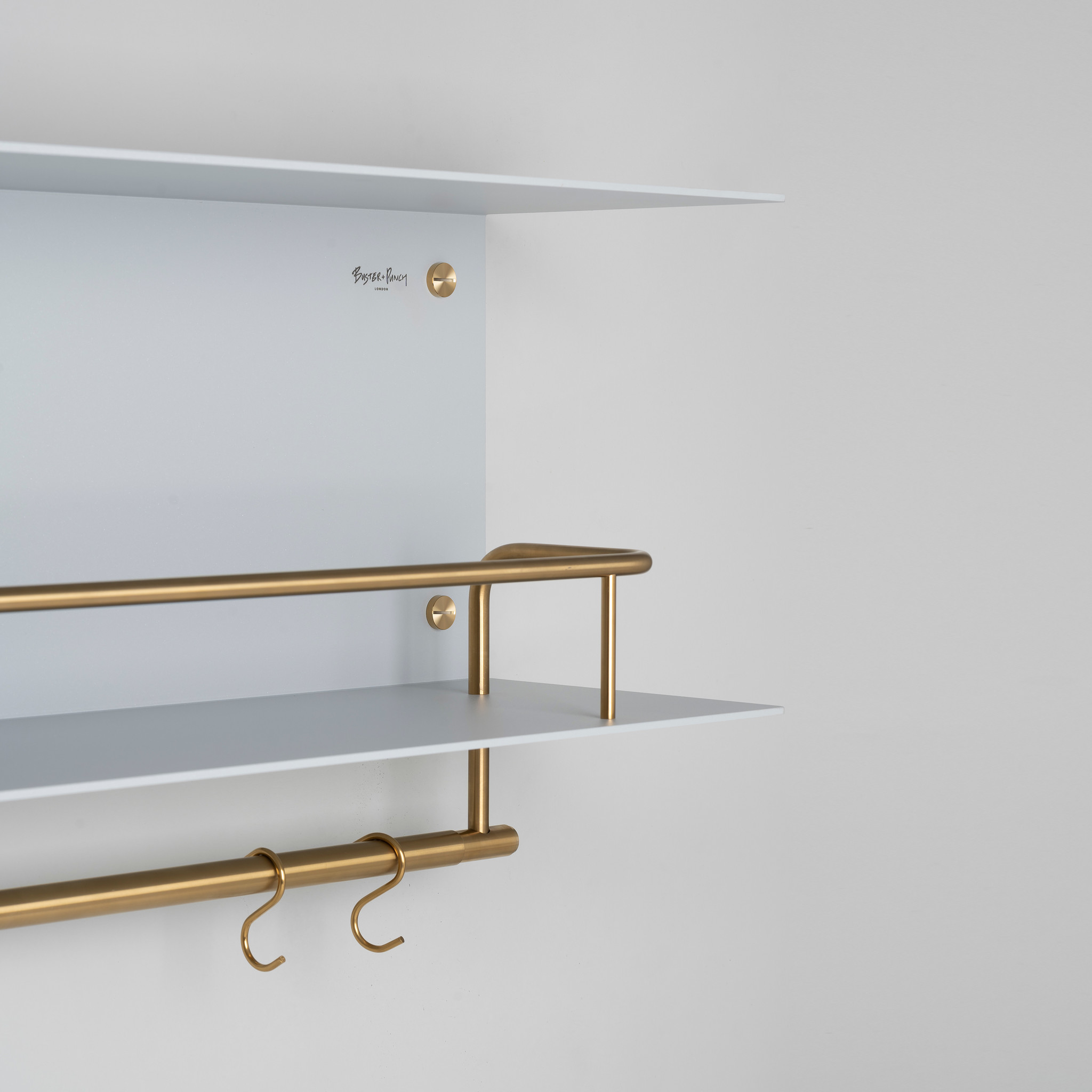 De opbergrek is gemaakt van lasergesneden aluminiumplaat van 4 mm, in vorm gebogen en gepoedercoat. Hij is voorzien van een 12 mm handgepolijste massief messing rand én een 20 mm massief messing pannenrail. Hij is afgewerkt met de kenmerkende bijpassende muntschroeven van Buster+Punch.