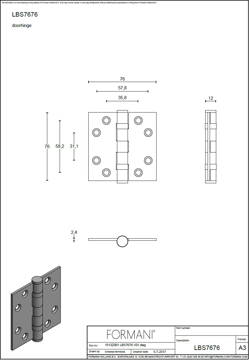 Beschrijving Formani kogellagerscharnier 76x76mm BASICS LBS7676 rechte hoeken mat RVS