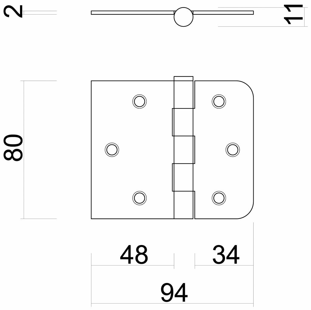 De totale afmetingen van deze scharnieren bedragen 94x80x2mm (BxHxD).