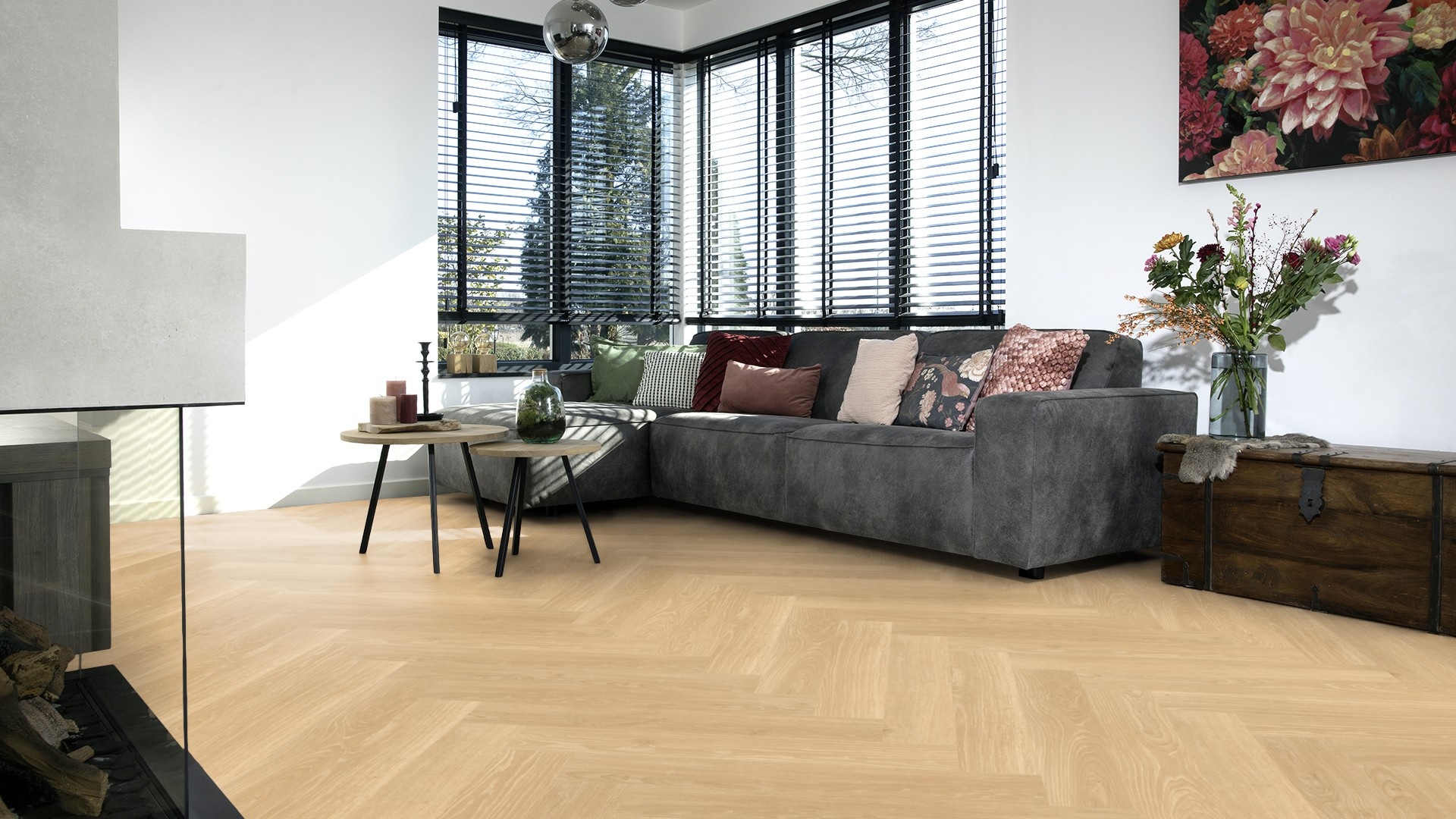 Beschrijving Visgraat Laminaat Kamille van Douwes Dekker. Vloeren met planken van 85 x 14 cm en een huishoudelijke levenslange garantie