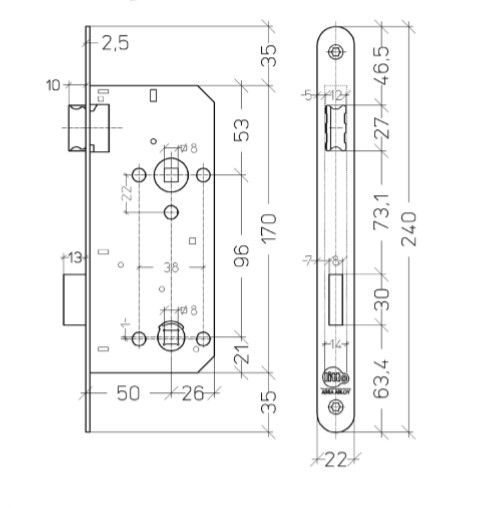 Dit wc-slot heeft 2 vierkante gaten van 8x8mm en wordt geleverd zonder sluitplaat.