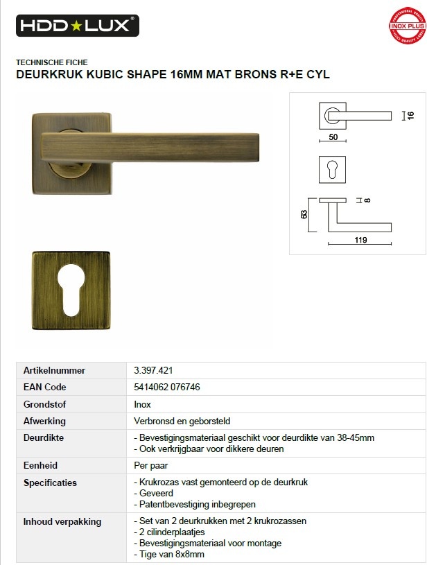HDD mat bronzen deurklinken KUBIC SHAPE 16 mm