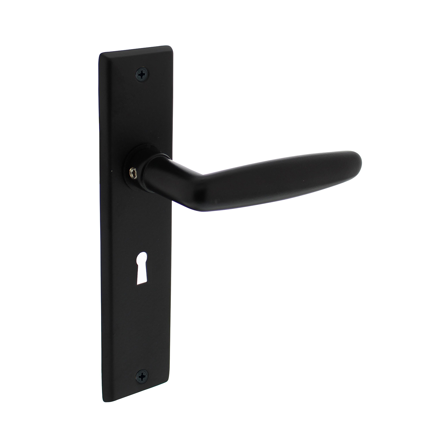 Beschrijving Intersteel Deurkruk "Sophie" met schild 181x41x7mm en het sleutelgat op 56mm van de handvat in mat zwart
