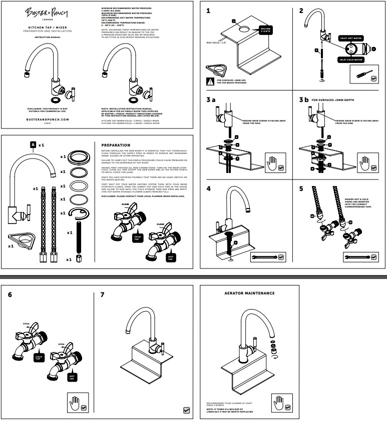 Alle Buster en Punch kranen voldoen aan de EN817 norm. De mengkranen zijn getest om te werken met een Max. druk van 10 Bar(1000 kPa) Het aanbevolen werkdrukbereik is 1,0 tot 5,0 Bar (100 kPa-500 kPa). Indien plaatselijk huisvestigingsvoorschriften anders voor schrijven raden we aan een gecertificeerde loodgieter te raadplegen.