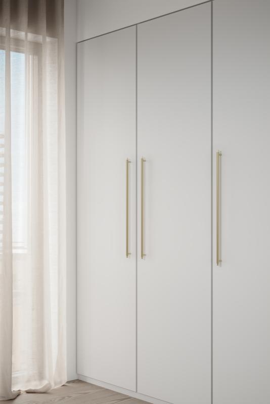 Deze langere meubelgreep is gemaakt uit aluminium en daarna voorzien van een goudkleurige coating.