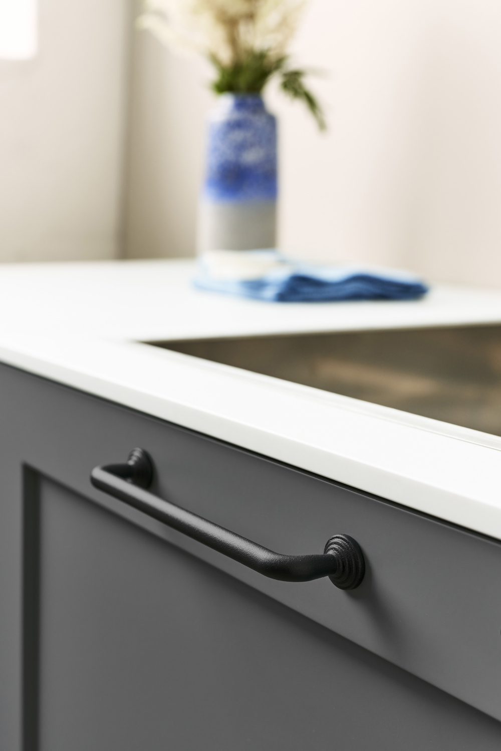 Beschrijving Rustieke meubelgreep van Furnipart ontworpen door Thomas Steffensen en Pia Würtz uit gietijzer met en mat zwarte structuur afwerking