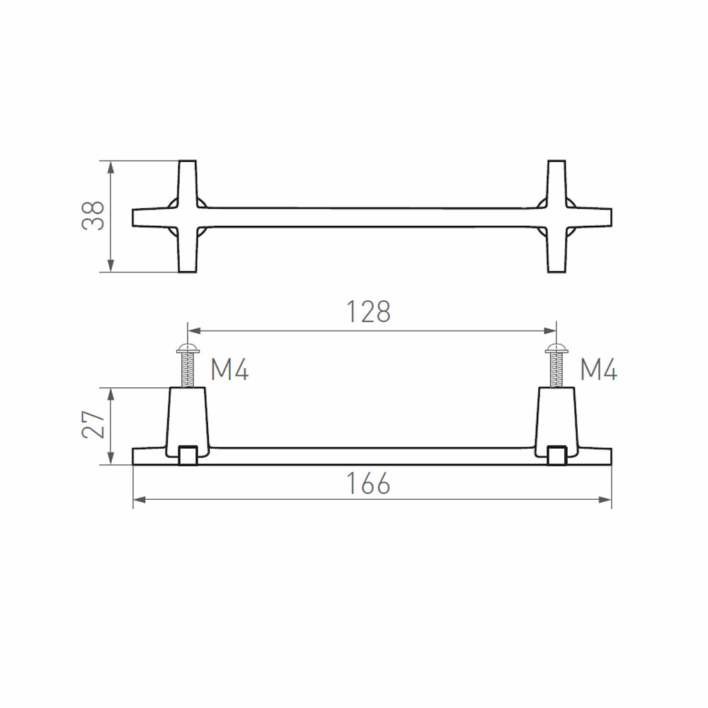 Kruisvormige meubelgreep met ronde voetjes en een asmaat van 128mm.
