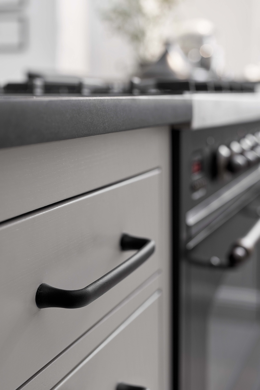 De meubelgreep PROVENCE kenmerkt zich door de fijne overgang van de ovale handgreep naar de ronde voet, waar de handgreep bijna versmelt met de voet.