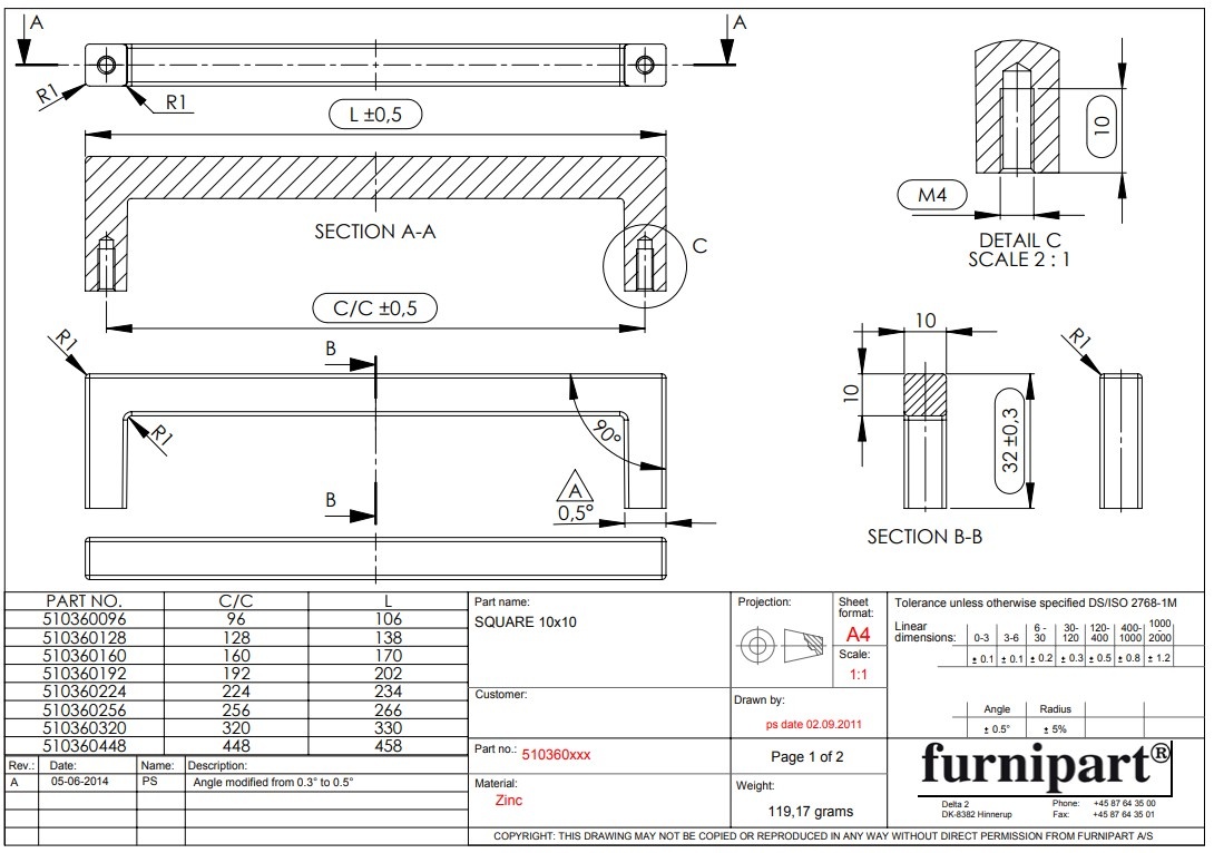 Beschrijving U- Vormige meubelgreep SQUARE van Furnipart in RVS look met een asmaat van 160 mm en totale breedte van 170 mm vierkant 10x10 mm