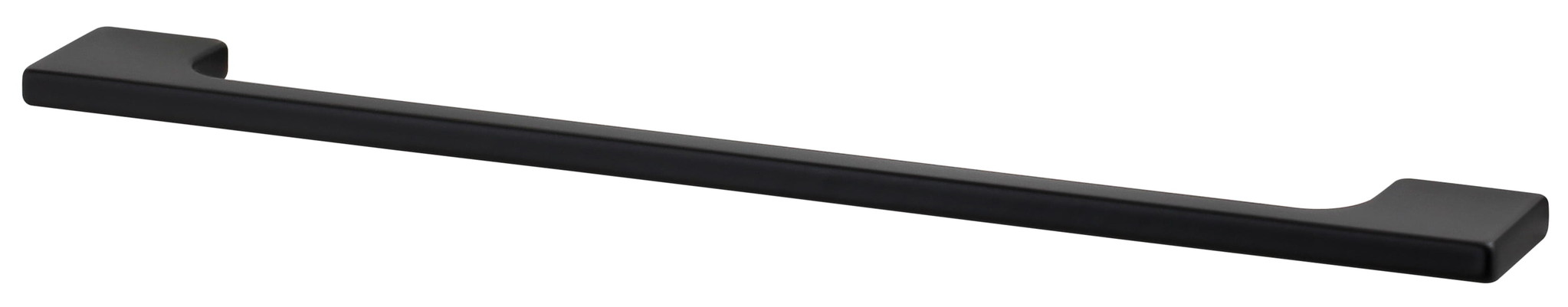 De platte meubelgreep is gemaakt uit zamac en voorzien van een zwarte coating.