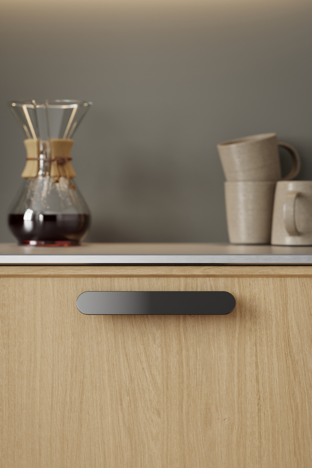 Het ontwerp is gebaseerd op een plaat die iets van het meubeloppervlak afstaat en onder een hoek is geplaatst. Dit zorgt niet alleen voor een verfijnde lichtreflectie, maar creëert ook extra ruimte voor een comfortabele grip.