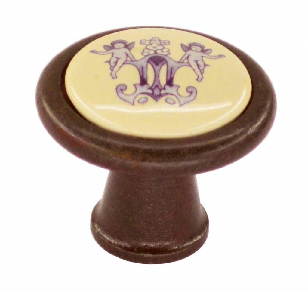 Deze klassiekere meubelknoppen hebben een verroeste kleur en zijn in het midden voorzien van een print.