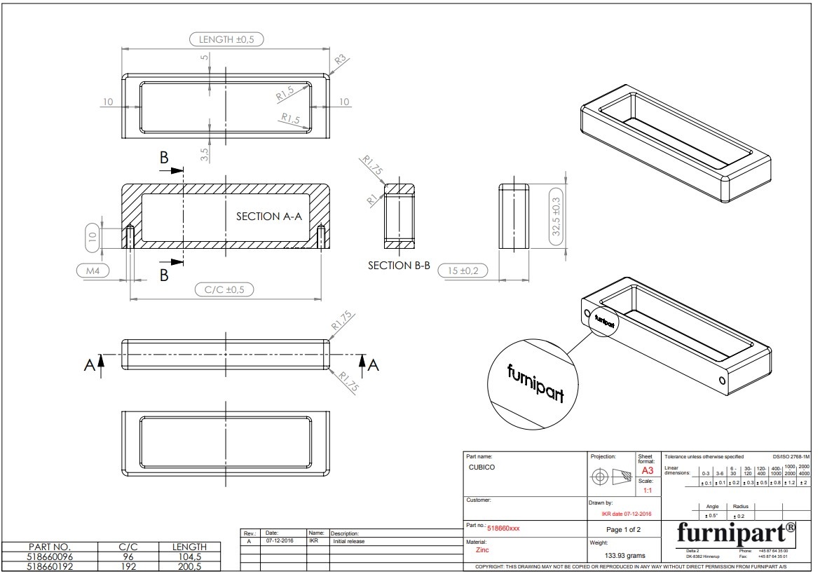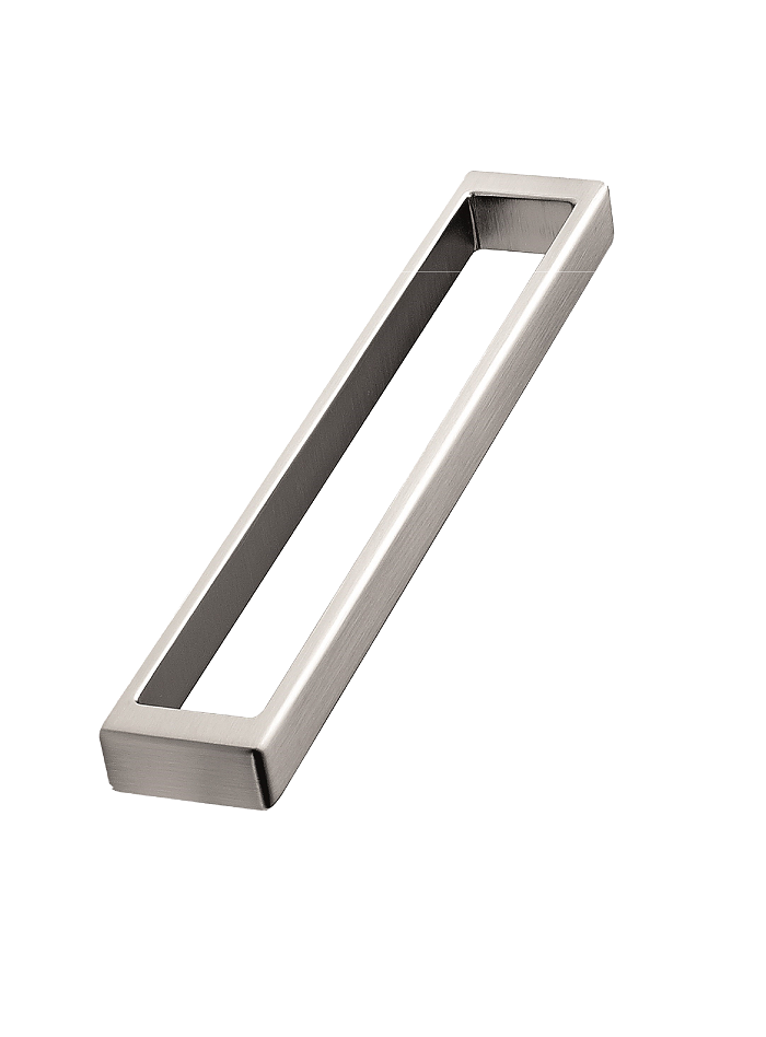Beschrijving Meubelgreep CUBICO van Furnipart met een asmaat van 192 mm en totale breedte van 202 mm met RVS uiterlijk