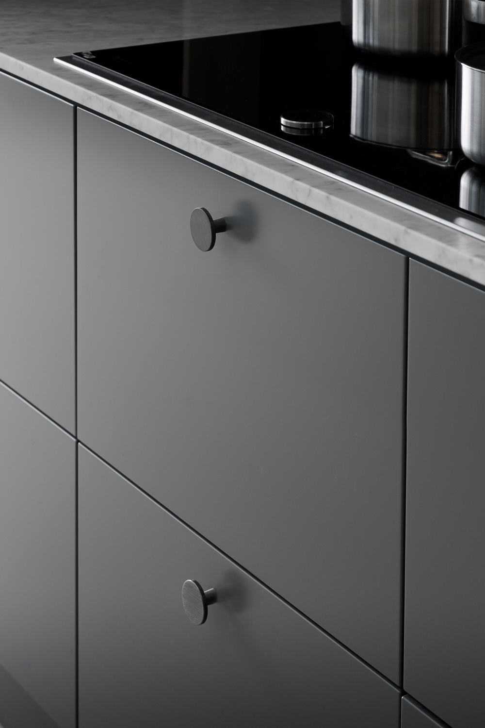 De ronde meubelknop is gemaakt uit aluminium en voorzien van een antraciet grijze coating. Als eindbewerking wordt de knop geborsteld.