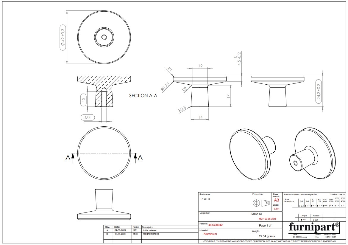 Beschrijving Zwarte geborstelde Furnipart Meubelknop PLATO Ø 42 mm uit aluminium