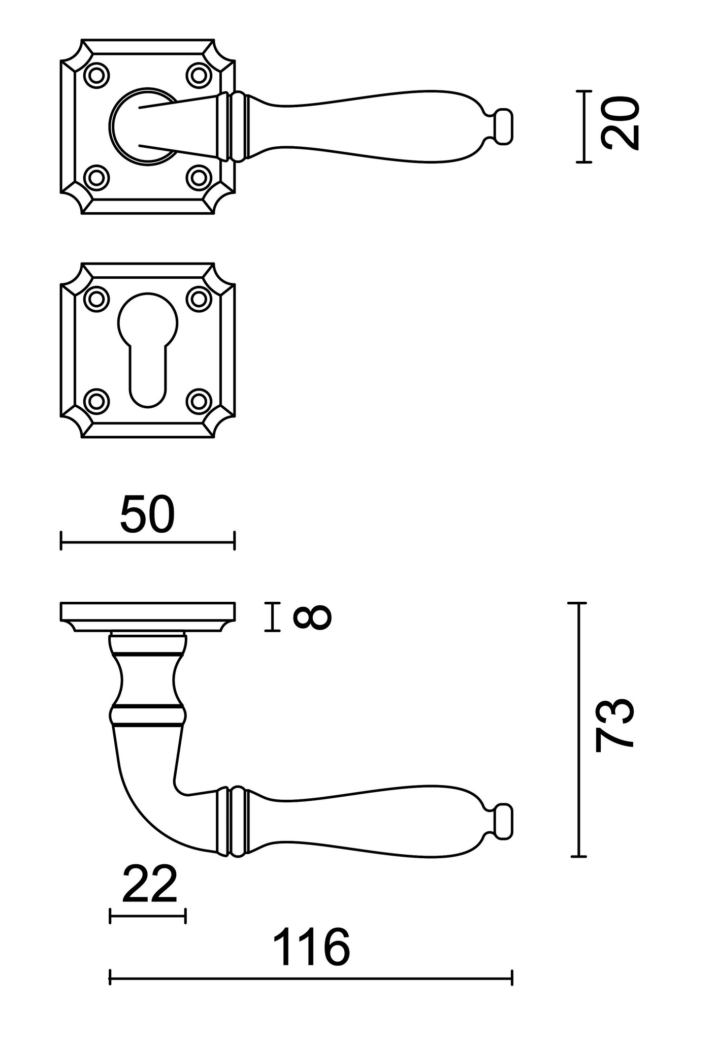 Beschrijving Oud zilveren deurklinken Lisa op een vierkant rozet leverbaar in 4 varianten