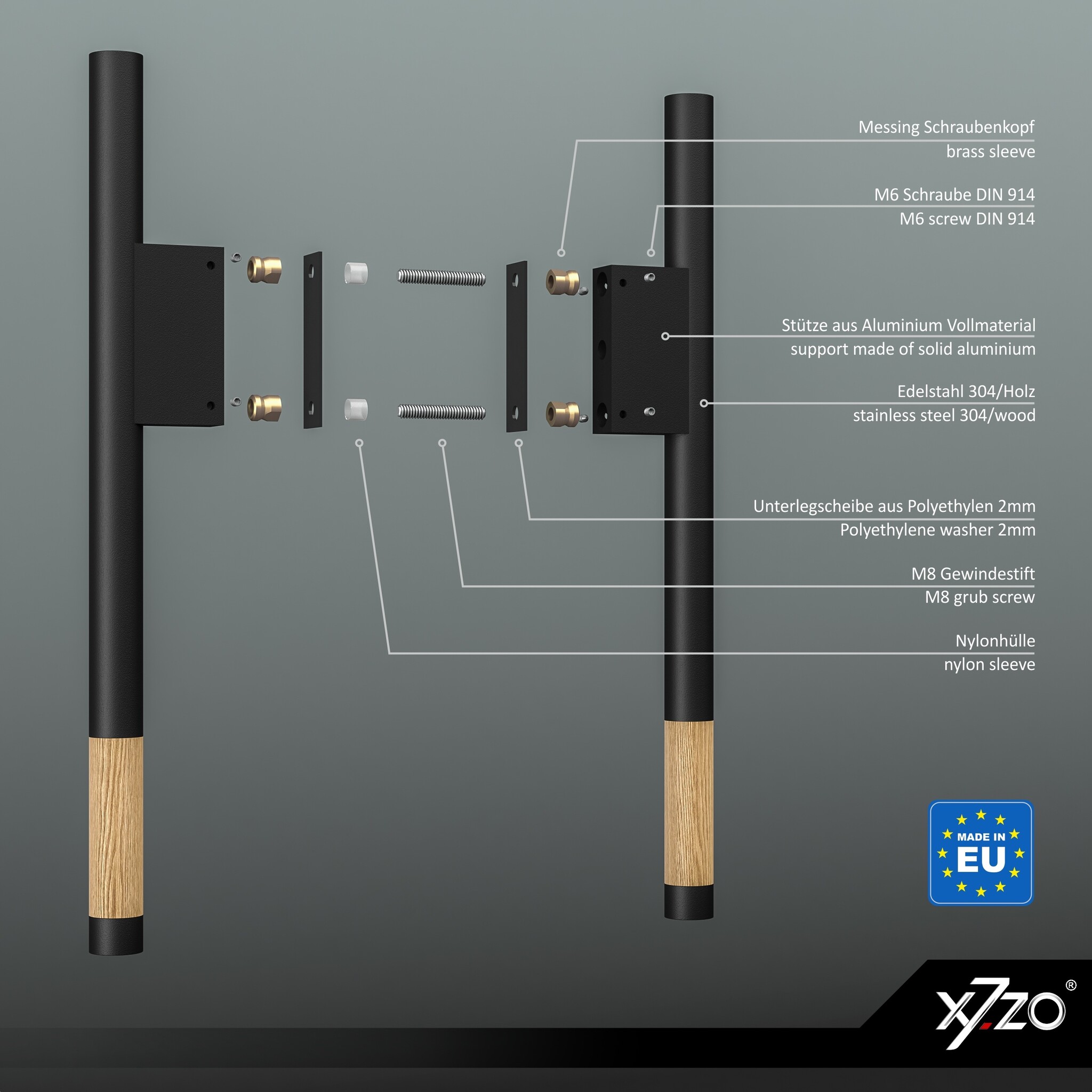 Het houten gedeelte wordt tot 3 x toe voorzien van een beschermende olie wat zorgt voor een lange levensduur van het hout. De deurgepen zelf zijn gemaakt uit RVS en worden afgewerkt met een geanodiseerde zwarte coating met fijne structuur. De voet zelf bestaat uit Aluminium, deze heeft 2 bevestigingspunten wat zorgt voor extra stevigheid (afstand tussen de 2 bevestigingspunten is 80mm).