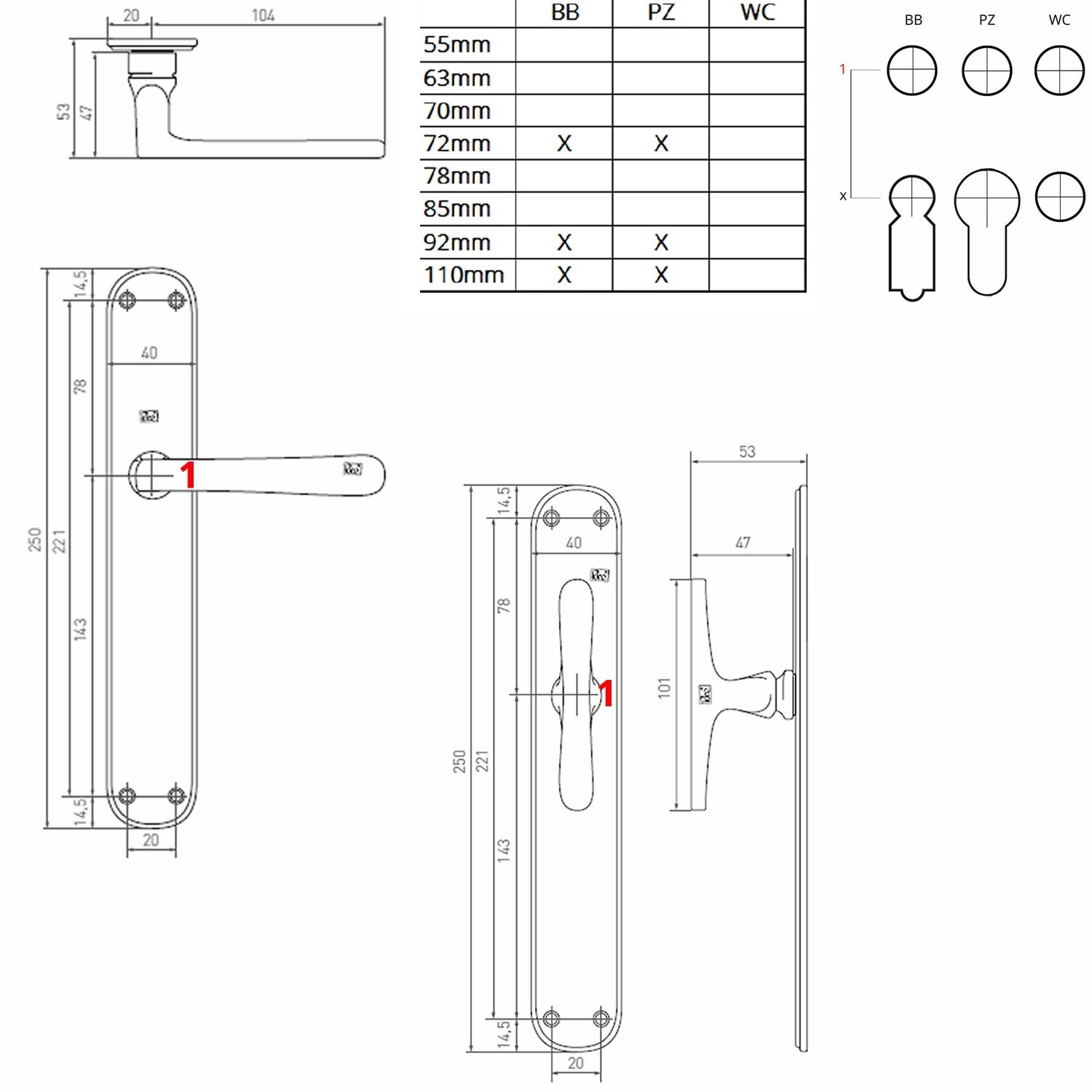 De zwarte langschilden van Pure® zijn beschikbaar in as-maat 72mm, 92mm en 110mm of blind, met normale sleutelopening (BB) en cilinderopening (PZ). Hierboven kan u de gewenste uitvoering selecteren. Op de technische tekening kan u zien hoe u de asmaat het best opmeet.