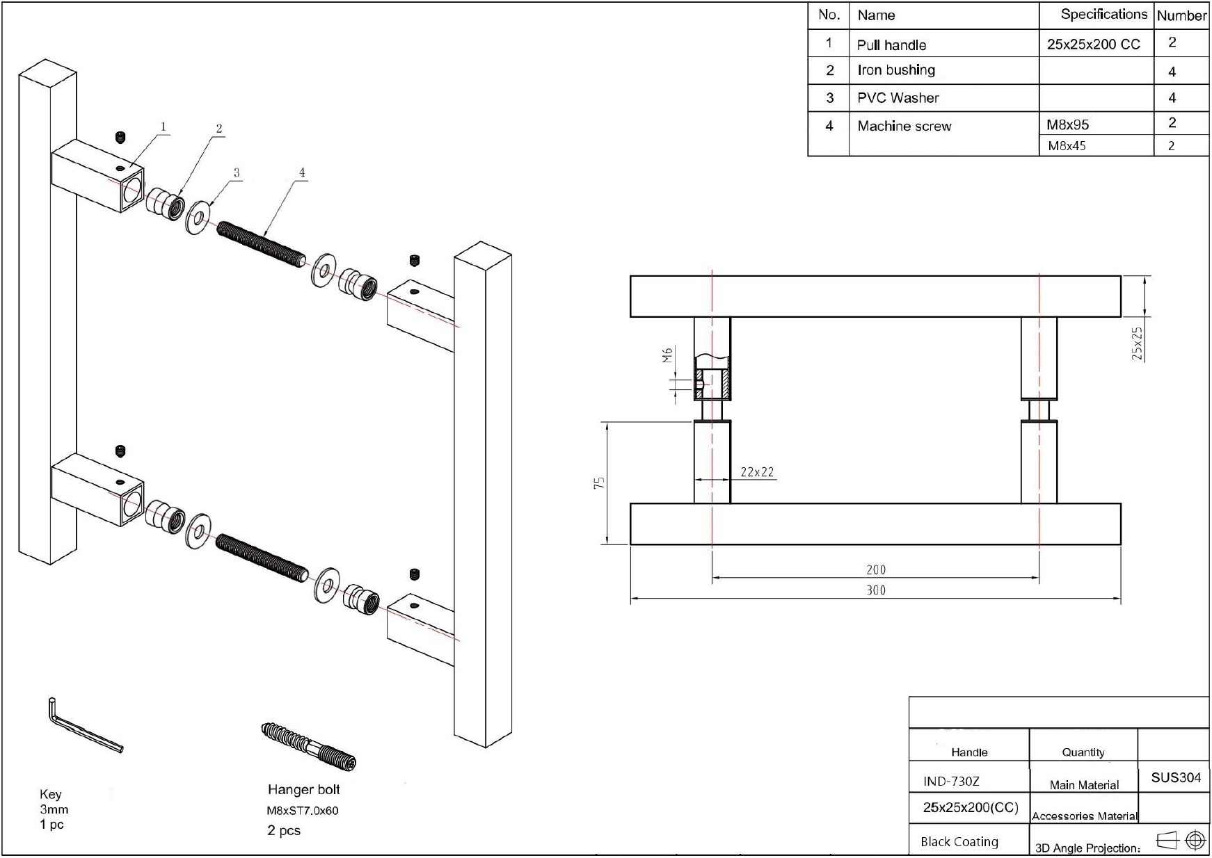 Beschrijving Paar zwarte vierkante deurgrepen 25x25mm met een HoH asmaat van 200mm en een totale lengte van 300mm