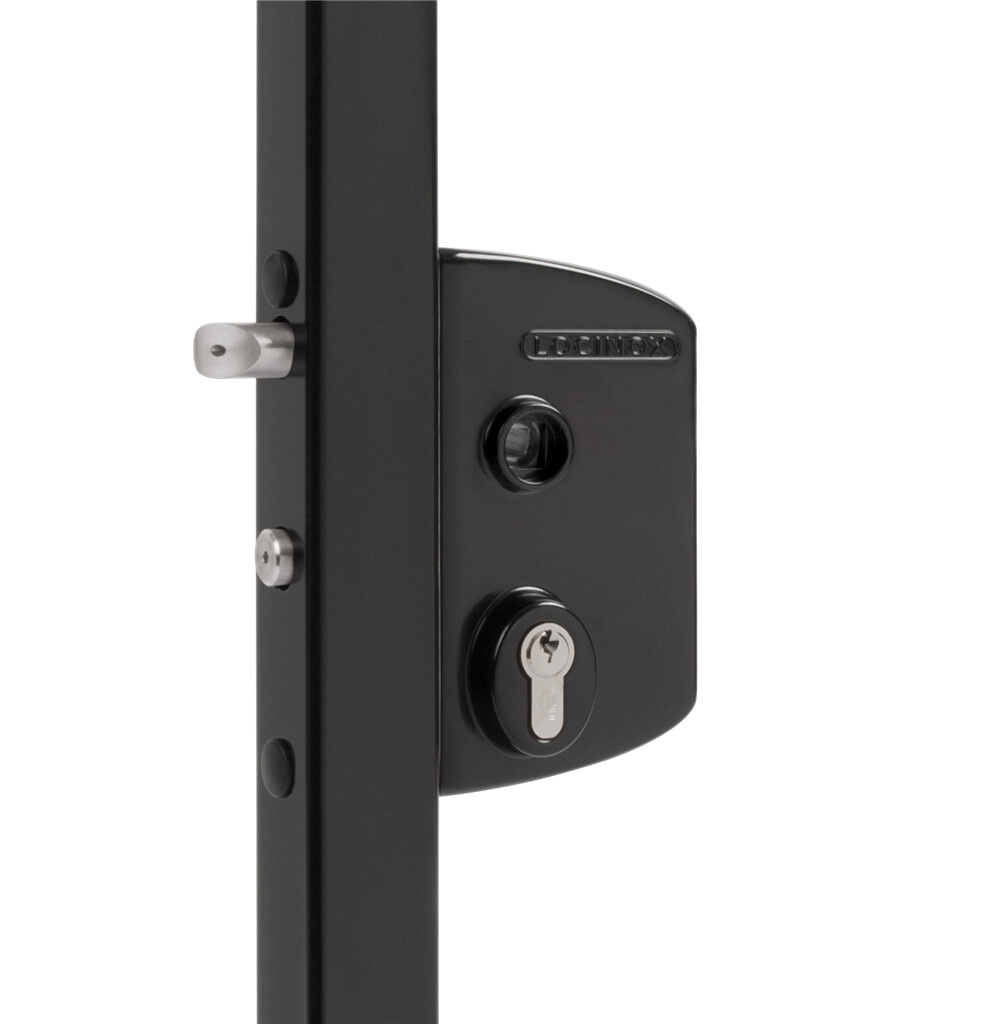 Het poortslot opbouw is ontworpen voor vierkante profielen van 40 tot 60 mm, zonder deurklink maar met cilinder. Met een verschillende sluiting biedt het extra veiligheid en gemoedsrust.