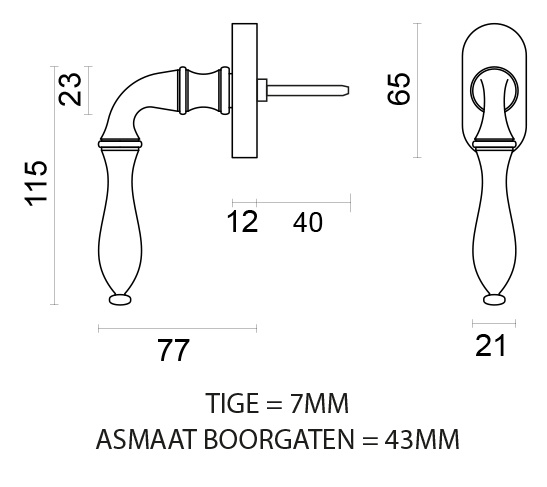 De oud-zilveren raamkrukken worden per stuk geleverd inclusief bevestigingsmaterialen en vierkantstift van 7X7X40mm. De bevestigingsgaten staan op een afstand van 43mm.