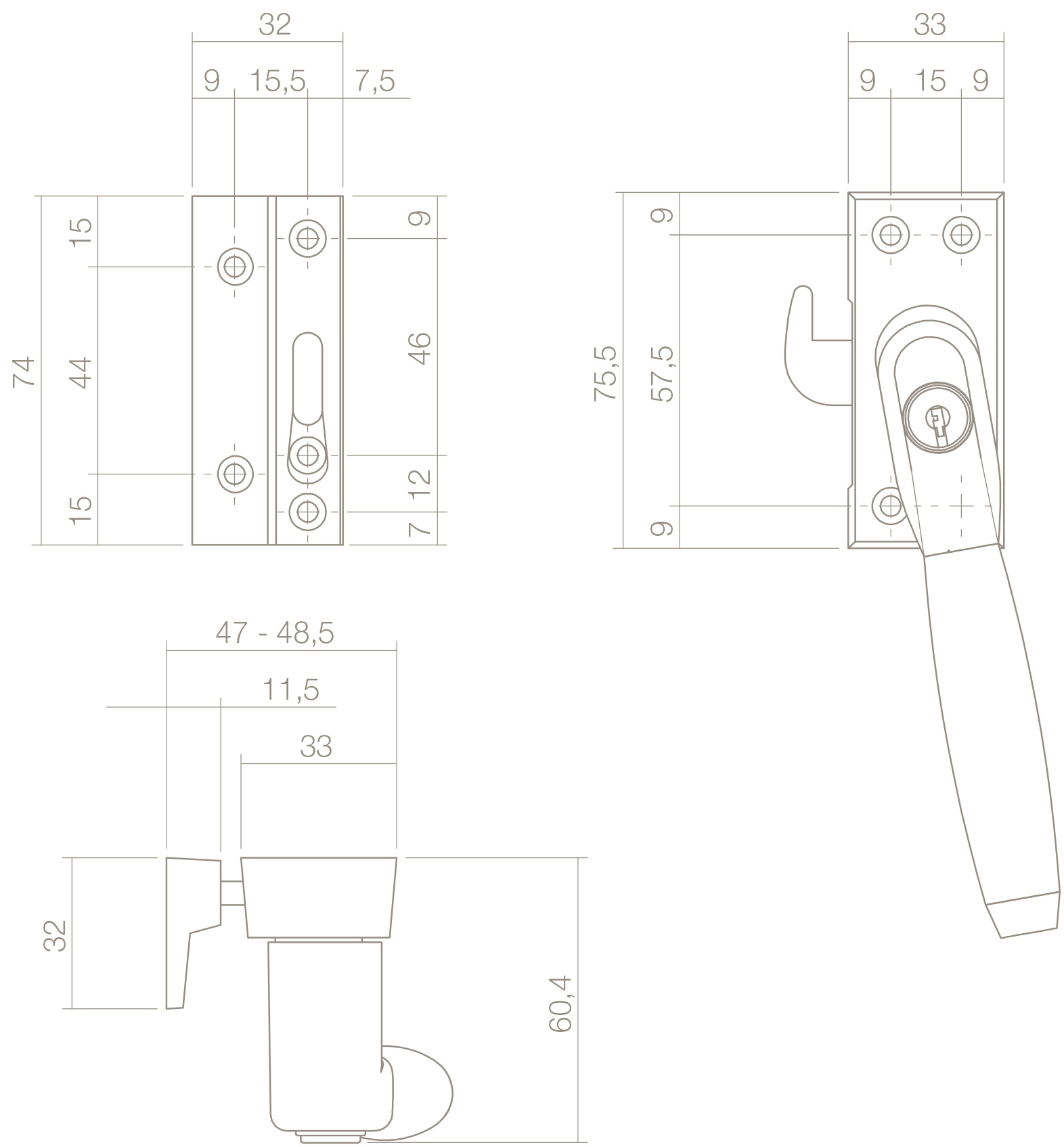 Door de raamsluiting te borstelen heeft deze raamkruk, met een L-vormige handvat op een rechthoekig rozet van 75x33 mm met een dikte van12 mm, een mat uiterlijk. De 4 bevestigingsgaten staan 57 mm en 15 mm uit elkaar.