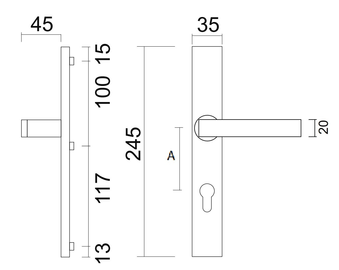 Deze veiligheidsgarnituren zijn in verschillende slotmaten te verkrijgen die je via het scrol menu kan selecteren. De slotmaat is de afstand hart klink tot hart cilinder. (A)