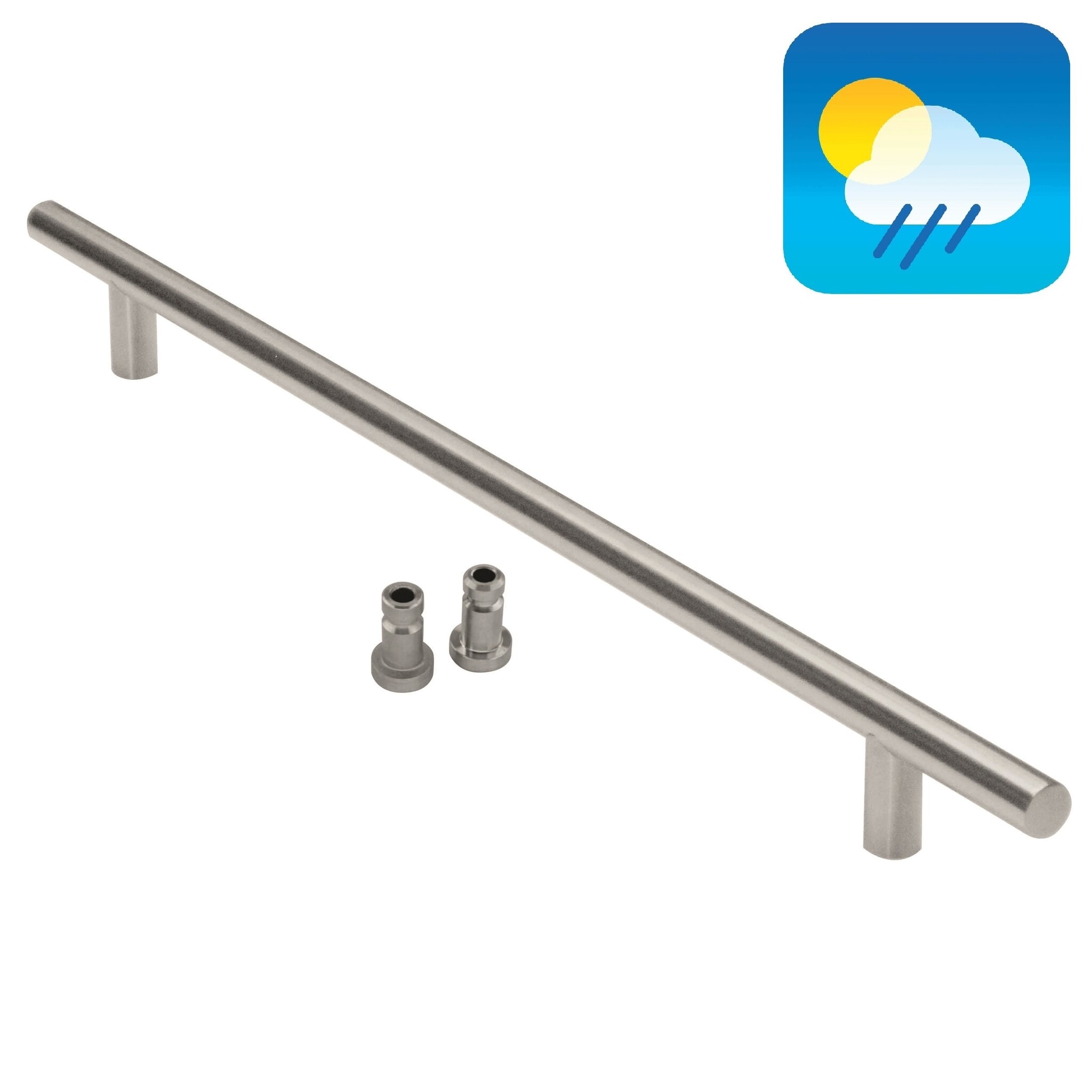 Beschrijving Mooie wat langere ronde deurgreep T- model met een moderne uitstraling die ook geschikt is voor buiten uitgevoerd in RVS om blind te monteren