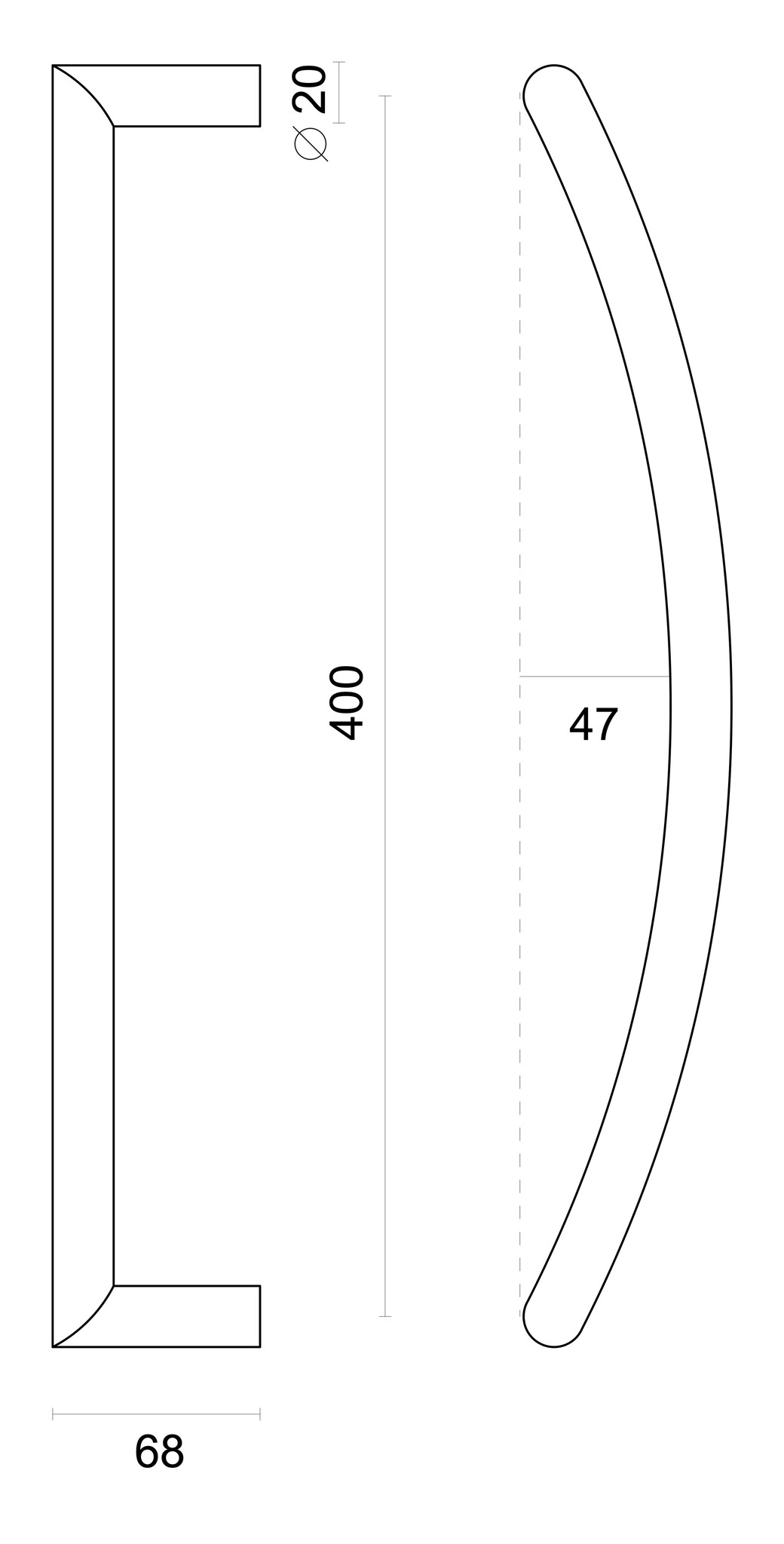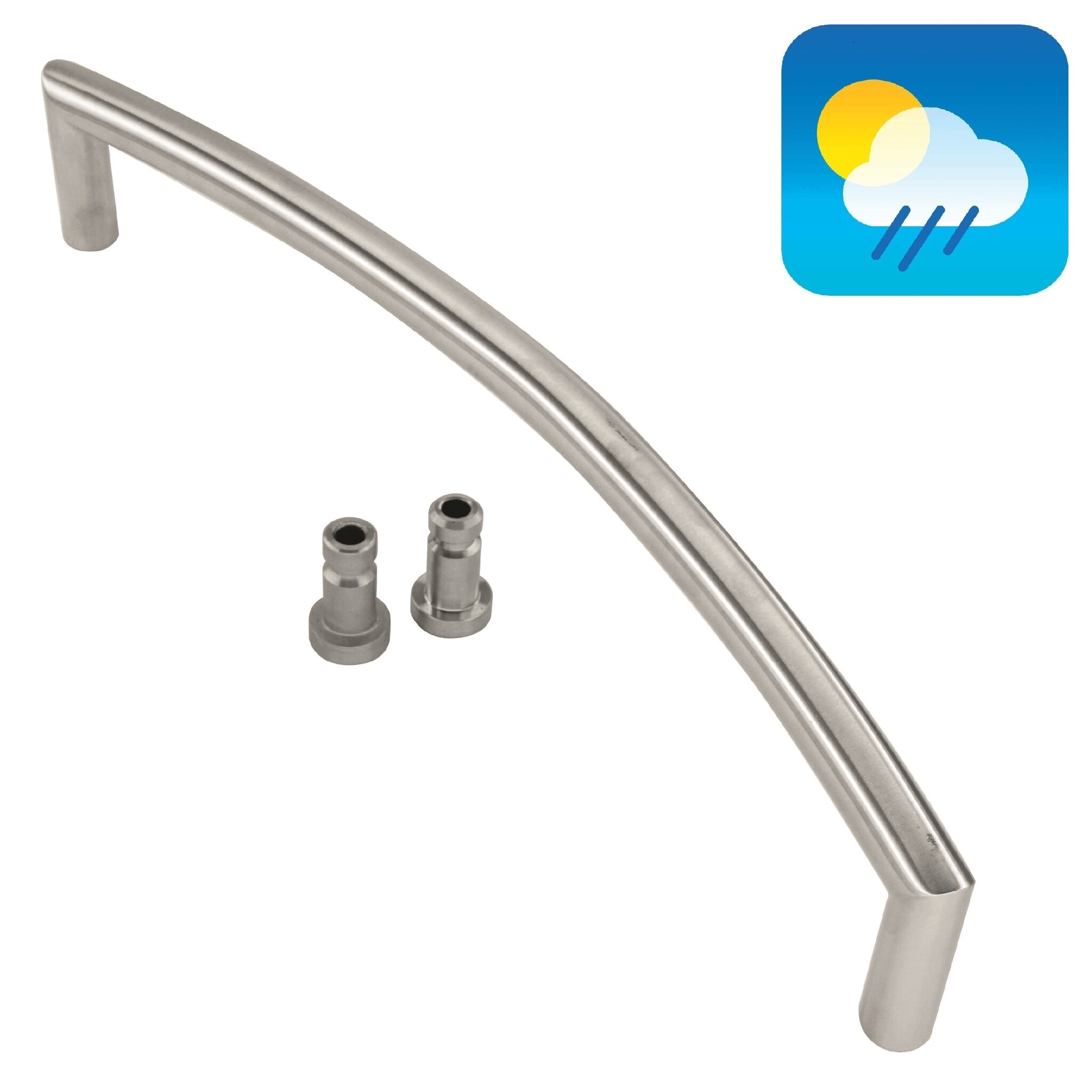 Beschrijving Moderne licht gebogen U- vormige deurgreep van 400 mm met strakke rechte hoeken in RVS om blind te monteren. Geschikt voor binnen en buiten