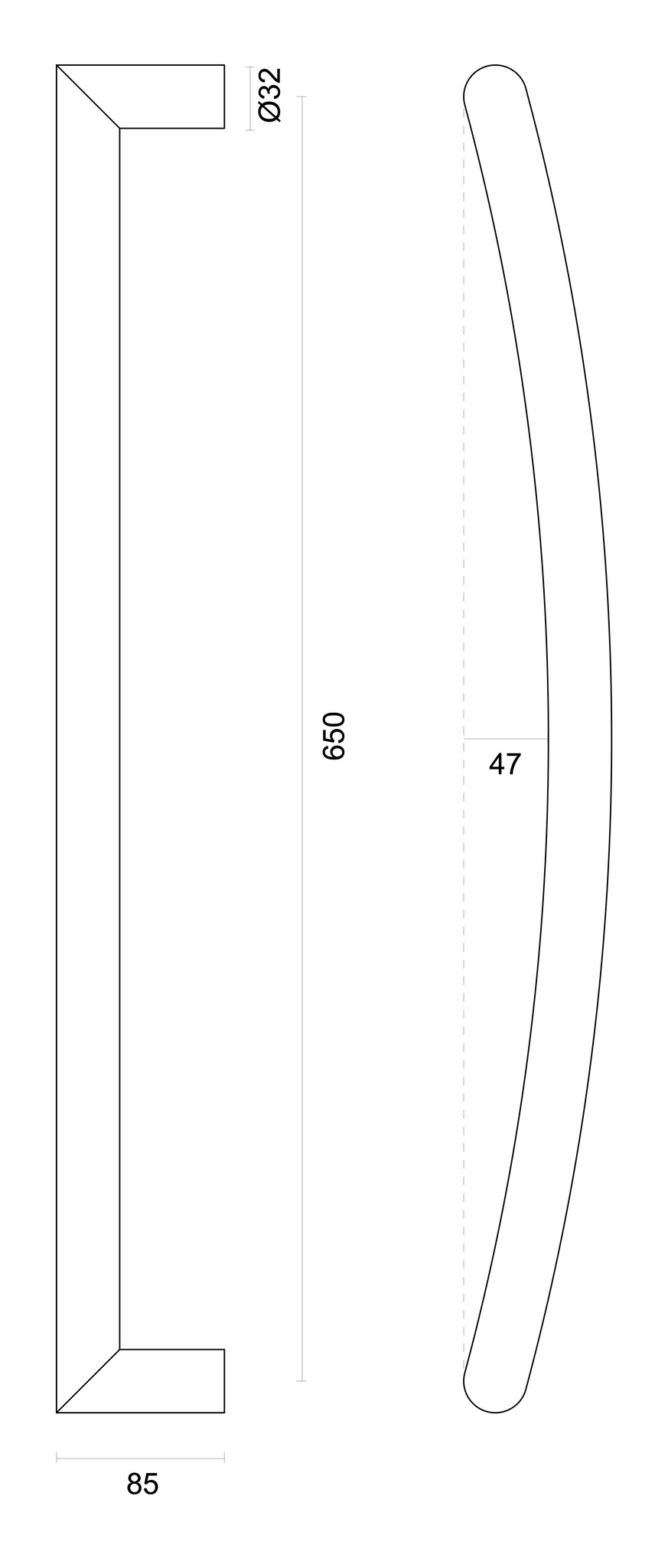 Beschrijving Moderne licht gebogen U- vormige deurgreep van 650 mm met strakke rechte hoeken in RVS om blind te monteren. Geschikt voor binnen en buiten