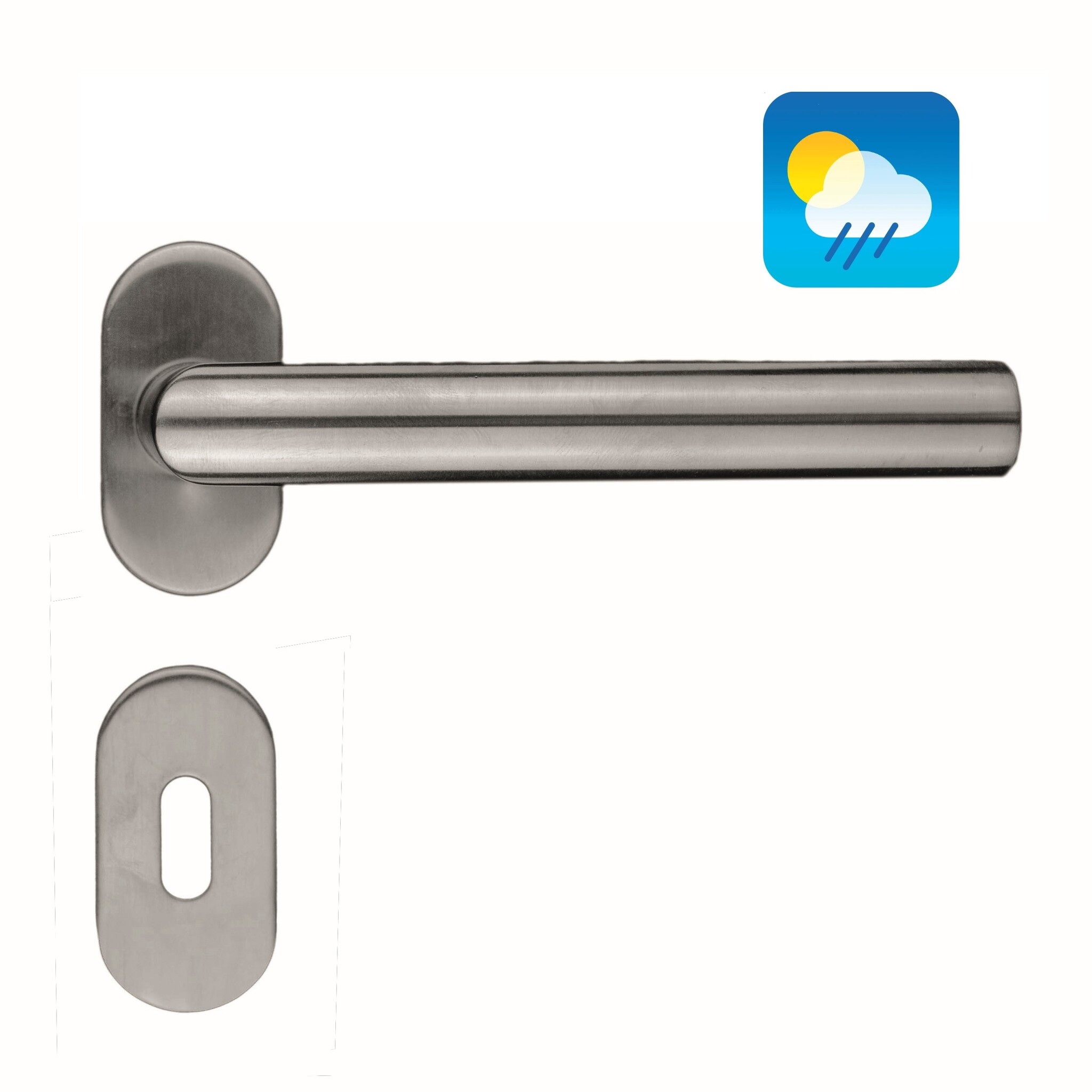 Beschrijving RVS deurklinken profiel "I Shape" op ovale rozetten en geschikt voor buiten leverbaar in 3 varianten