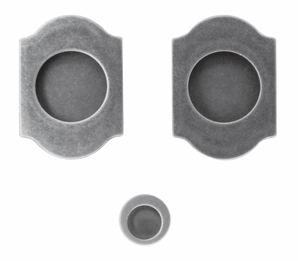 Mooie set retro schuifdeurkommen gemaakt uit messing en daarna voorzien van een sterke oud zilveren coating.