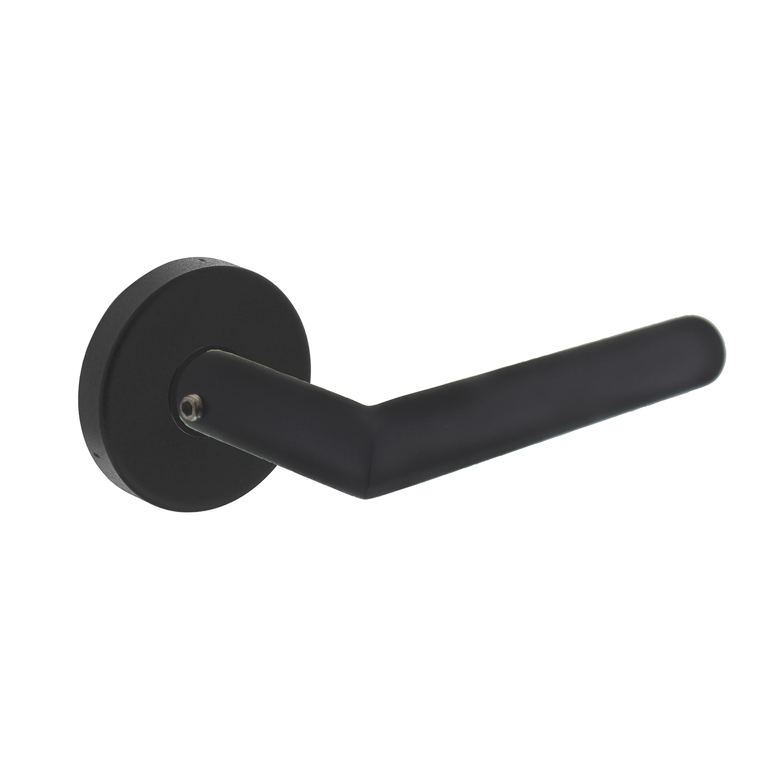 Beschrijving Zwarte deurklinken voor buiten op ronde dubbel geveerde rozetten uit massief RVS