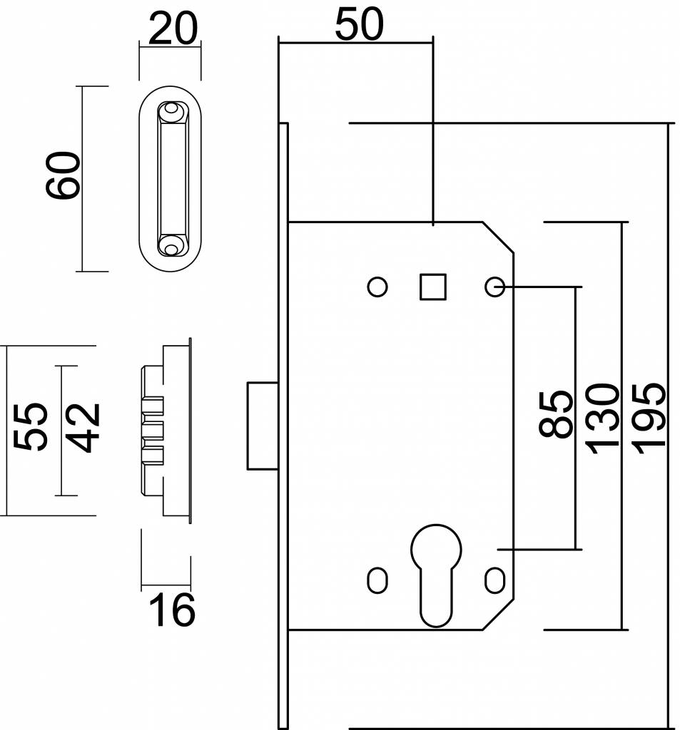 De afstand tussen het hart van de stift en het cilindergat bedraagt 85 mm.